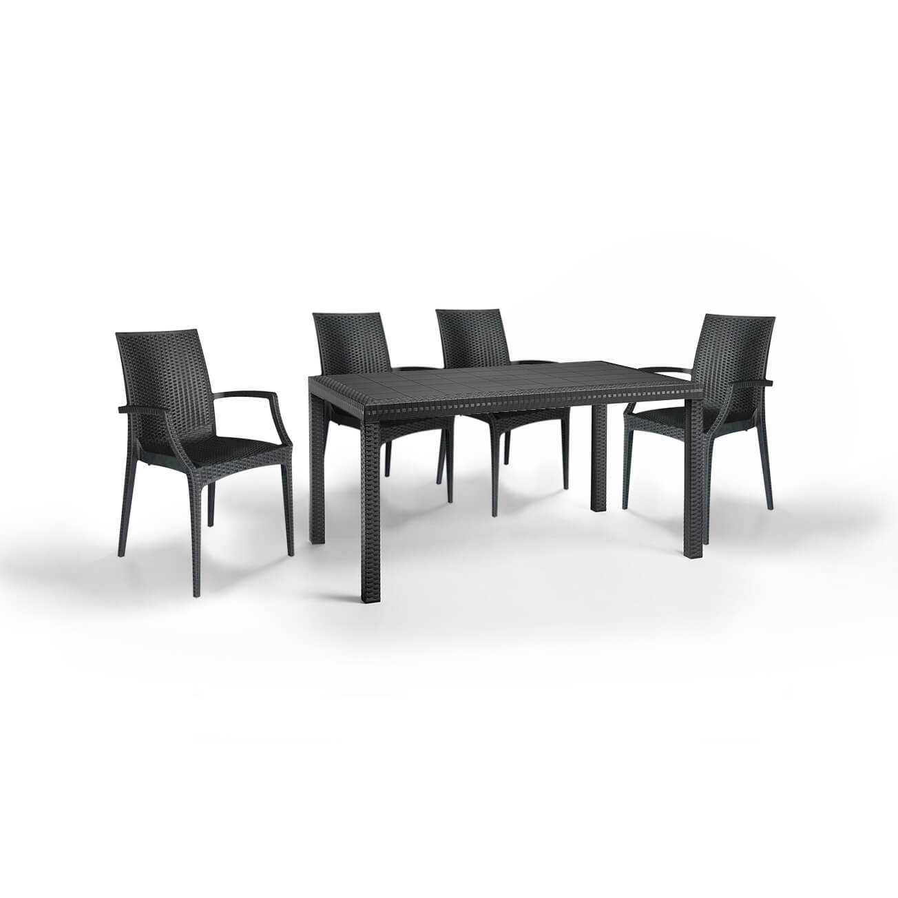 Baštenska garnitura Duži sto + 4 Bistrot stolice je otporna na sve vremenske uslove i zahteva minimalna održavanja sa garancijom dugotrajnosti, bez znakova starenja.