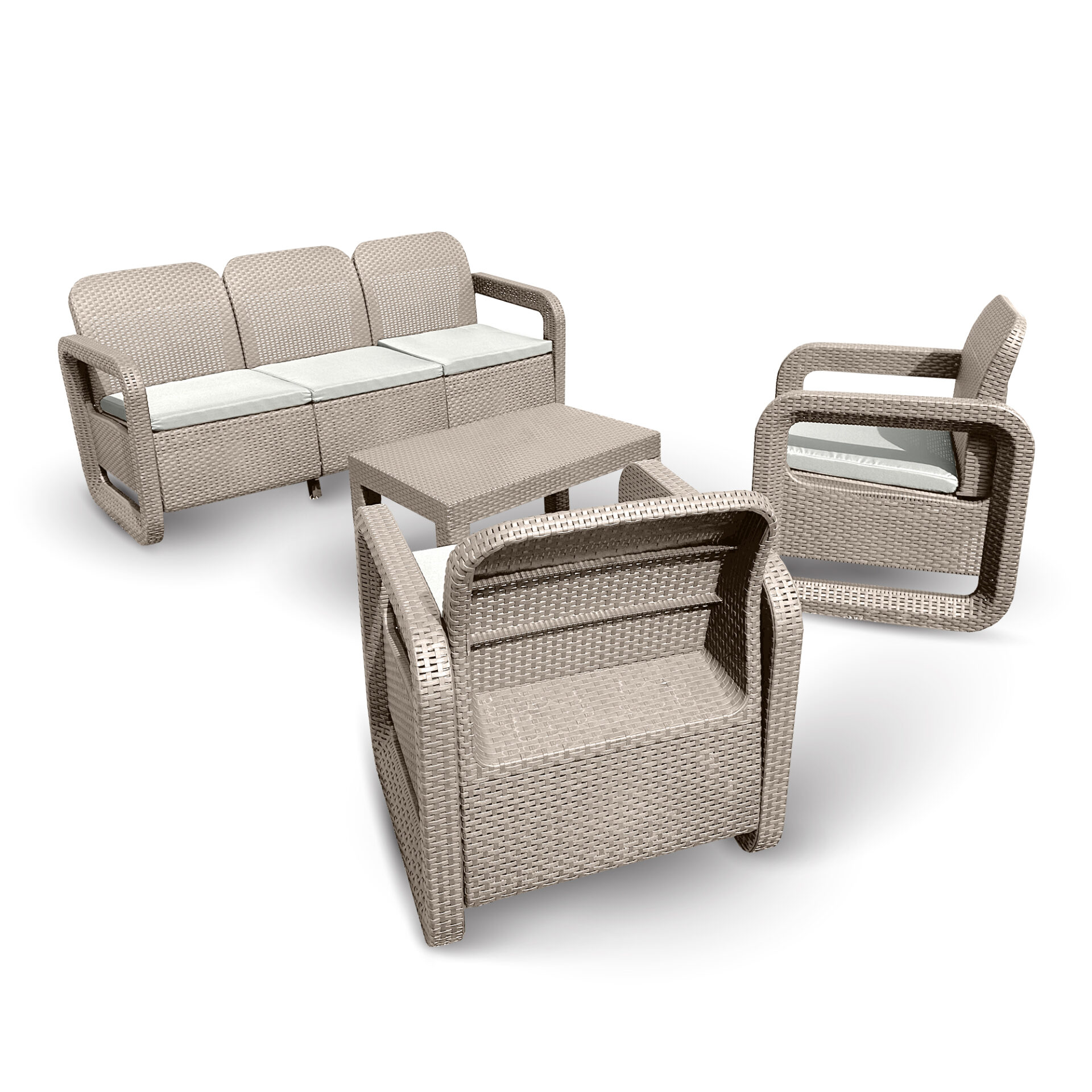 Sastoji se od dve udobne fotelje, troseda i praktičnog stola, idealnog za odlaganje pića, knjiga ili dekorativnih predmeta. Svaki element je pažljivo izrađen od kvalitetnog ratana, poznatog po svojoj otpornosti na vremenske uslove, što garantuje dug vek trajanja.