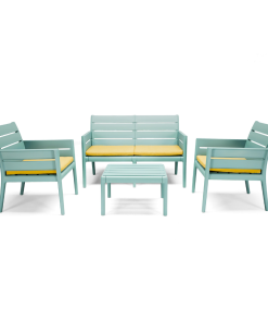 Garnitura se sastoji od dvoseda, dve fotelje i klub stola, uz četiri jastuka za sedenje koji dodatno doprinose komforu. Konstrukcija je izrađena od recikliranog polipropilena sa UV zaštitom, što obezbeđuje dugotrajnost, otpornost na spoljašnje uticaje i lako održavanje.