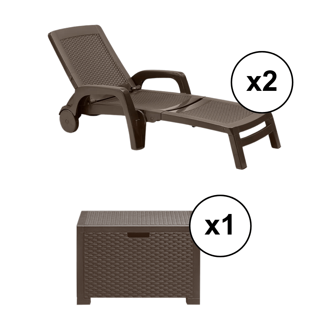 Ovaj elegantni komplet uključuje 2 sklopive Miami ležaljke i sto, idealan za opuštanje na otvorenom prostoru.